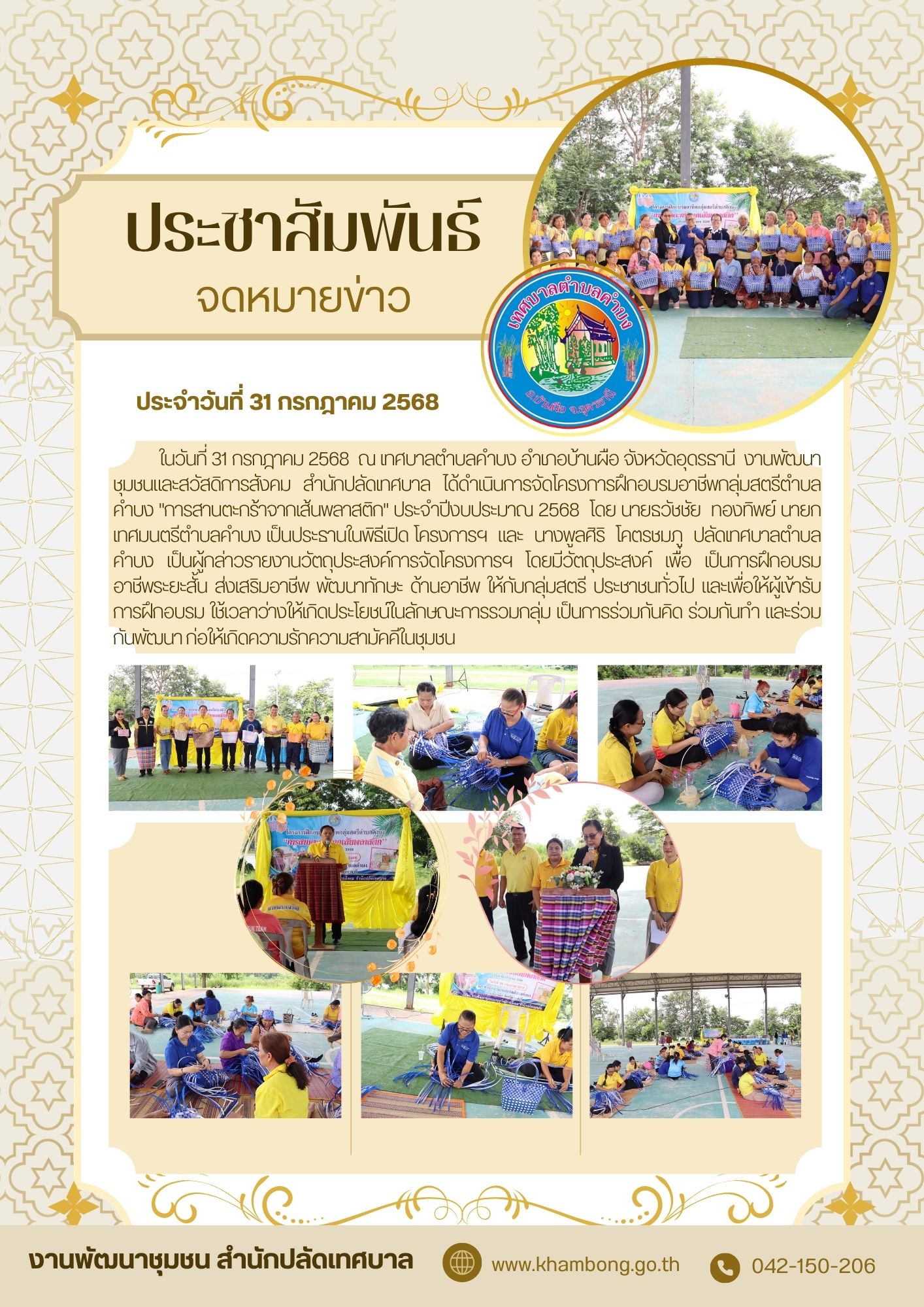 ในวันที่ 31 กรกฎาคม 2568 ณ เทศบาลตำบลคำบง อำเภอบ้านผือ จังหวัดอุดรธานี งานพัฒนาชุมชนและสวัสดิการสังคม สำนักปลัดเทศบาล ได้ดำเนินการจัดโครงการฝึกอบรมอาชีพกลุ่มสตรีตำบลคำบง "การสานตะกร้าจากเส้นพลาสติก" ประจำปีงบประมาณ 2568 โดย นายธวัชชัย ทองทิพย์ นายกเทศมนตรีตำบลคำบง เป็นประธานในพิธีเปิด โครงการฯ และ นางพูลศิริ โคตรชมภู ปลัดเทศบาลตำบลคำบง เป็นผู้กล่าวรายงานวัตถุประสงค์การจัดโครงการฯ โดยมีวัตถุประสงค์ เพื่อ เป็นการฝึกอบรมอาชีพระยะสั้น ส่งเสริมอาชีพ พัฒนาทักษะ ด้านอาชีพ ให้กับกลุ่มสตรี ประชาชนทั่วไป และเพื่อให้ผู้เข้ารับการฝึกอบรม ใช้เวลาว่างให้เกิดประโยชน์ในลักษณะการรวมกลุ่ม เป็นการร่วมกันคิด ร่วมกันทำ และร่วมกันพัฒนา ก่อให้เกิดความรักความสามัคคีในชุมชน